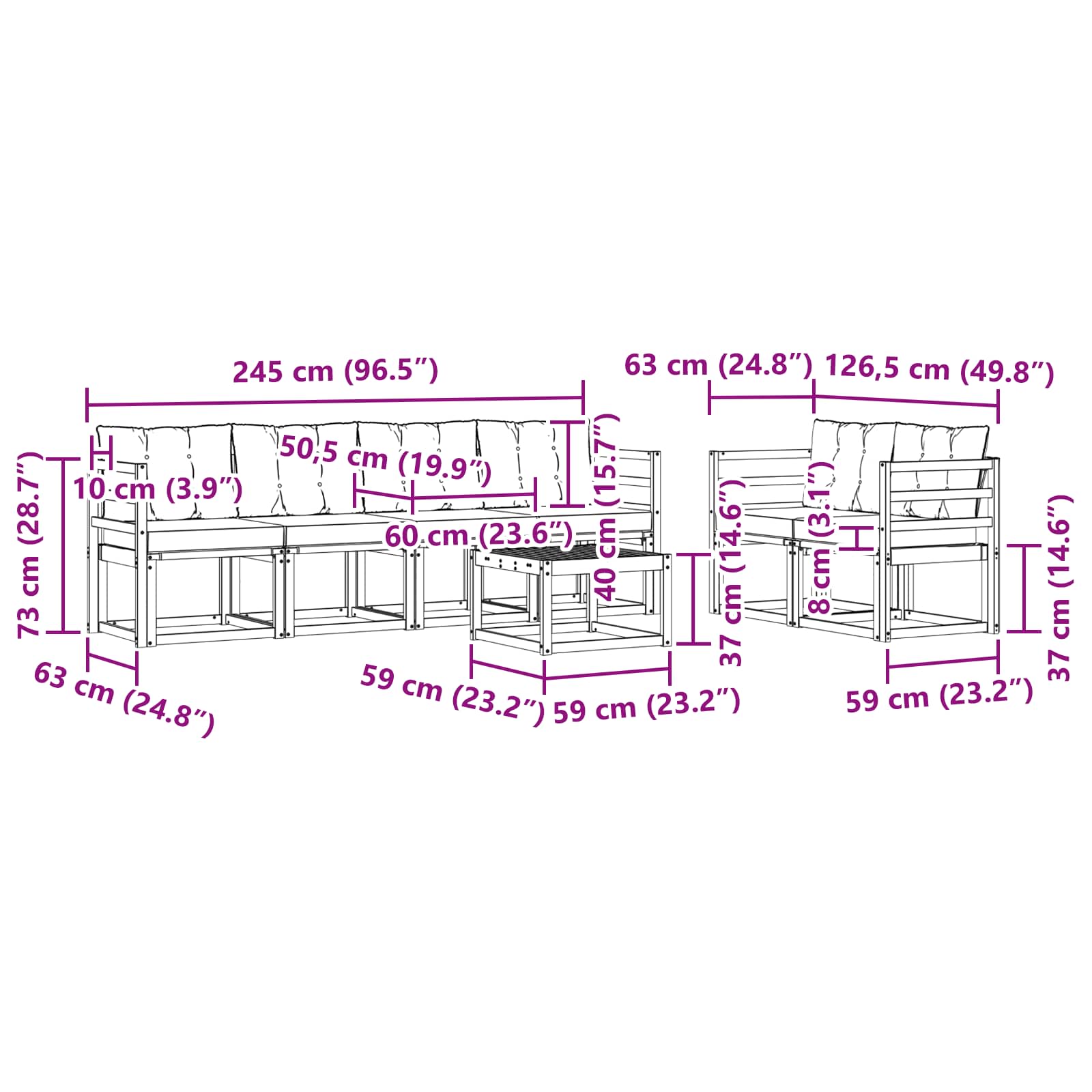 - 6 x Srednji kavč: 59 x 63 x 73 cm (D x Š x V)