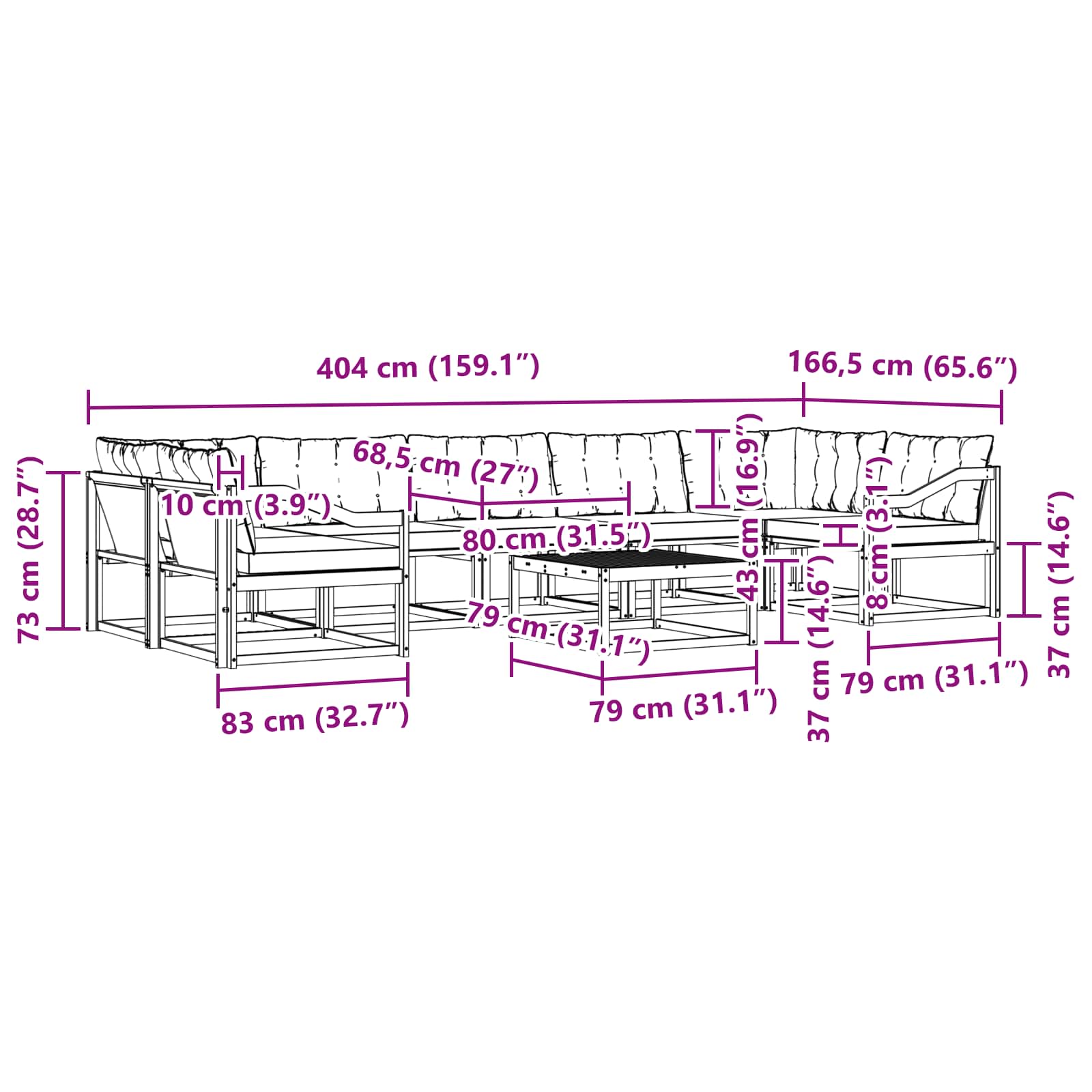 - 9 x Blazina za hrbet: 80 x 43 x 10 cm (D x Š x V)