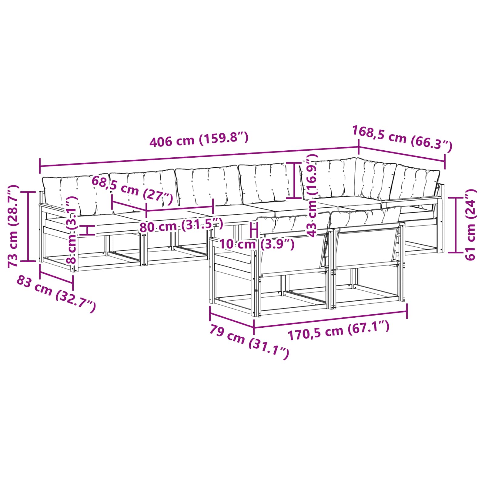 - 7 x sedežna blazina: 80 x 68,5 x 8 cm (DŠV)