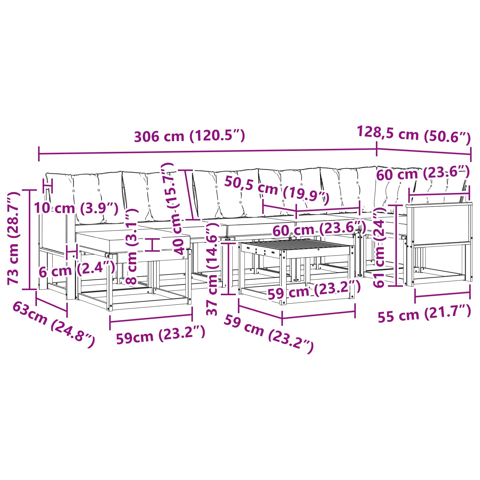 - 5 x Srednji kavč: 59 x 63 x 73 cm (D x Š x V)