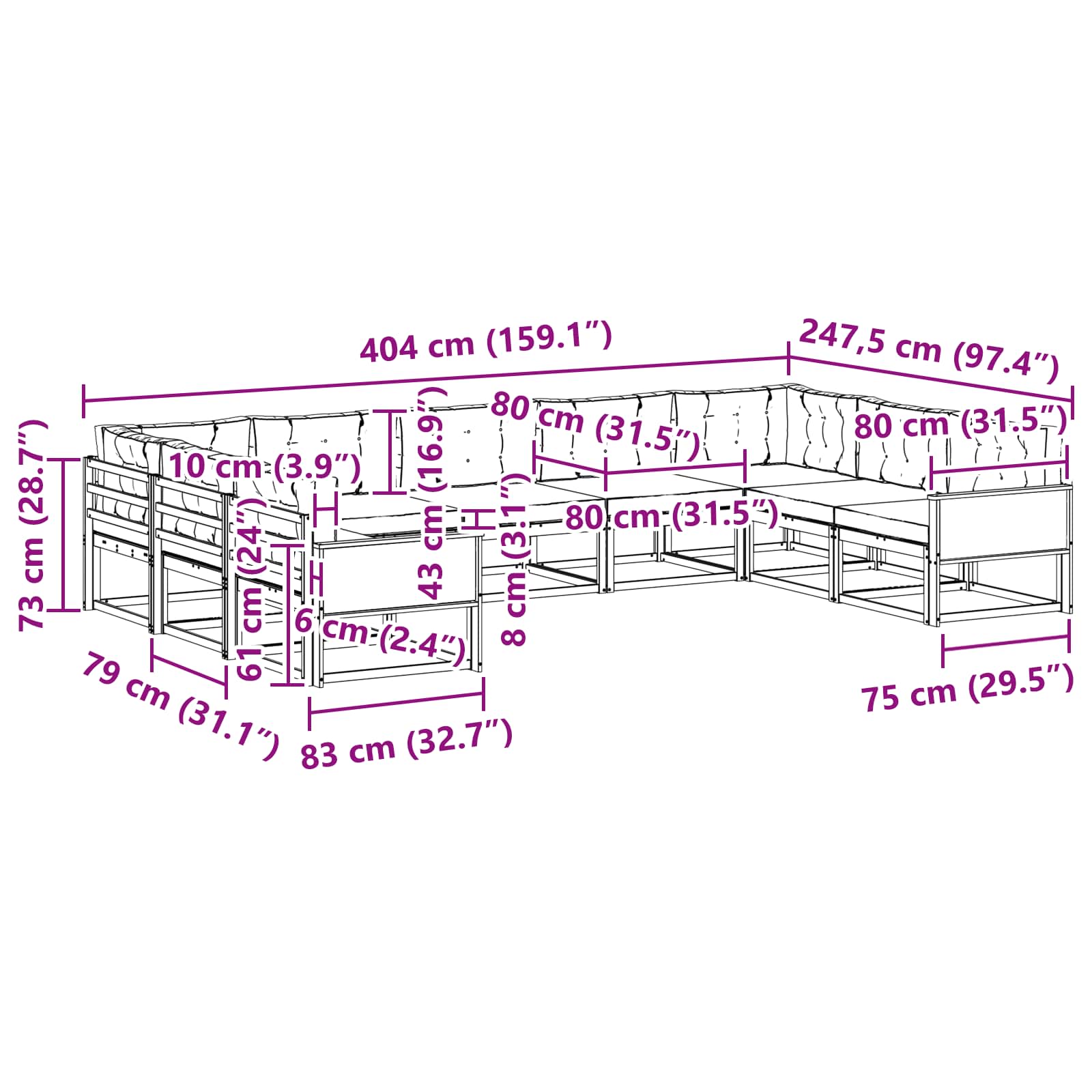 - 9 x blazina za sedež: 80 x 80 x 8 cm (D x Š x T)