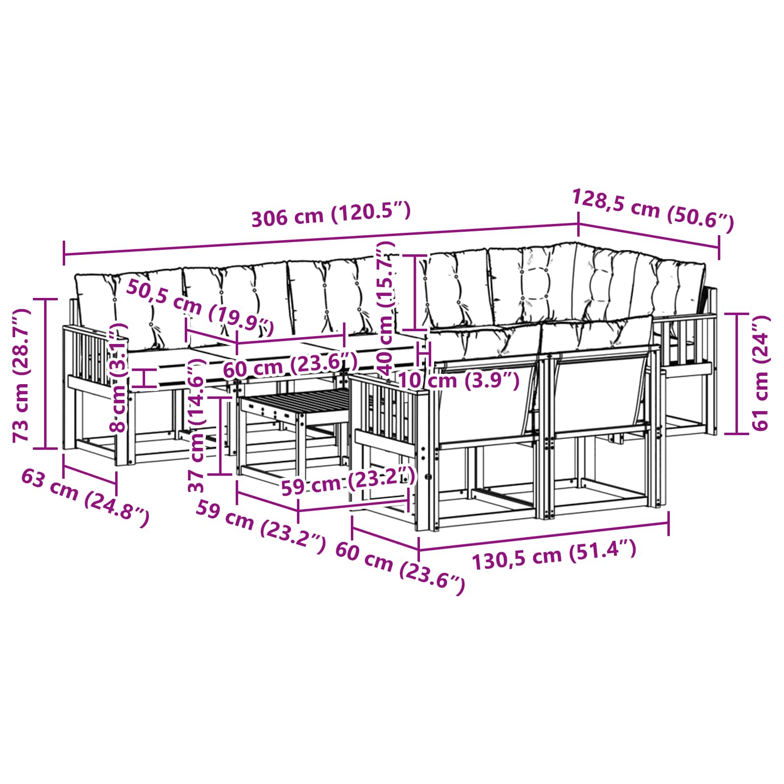 - 7 x Sedežna blazina: 60 x 50,5 x 8 cm (D x Š x V)