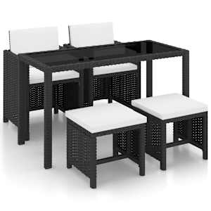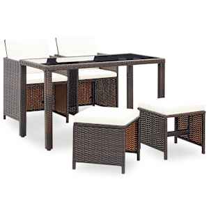 Naš stilski komplet vrtnega pohištva iz ratana bo prava zvezda vašega vrta ali verande! Ta jedilni komplet elegantne oblike bo odlična izbira za večerjanje ali sproščanje na vrtu. Jeklen okvir zagotavlja, da so miza, stoli in stolčki močni in čvrsti. Zahvaljujoč lahki konstrukciji so vsi kosi pohištva enostavni za premikanje. PE ratan je odporen na vremenske vplive in vodo, zato je komplet jedilnega pohištva enostaven za čiščenje. Tudi steklena površina mize omogoča preprosto čiščenje z vlažno krpo. Debele, mehke, s peno polnjene blazine so zelo udobne, narejene pa so iz vodoodpornega poliestra. Odstranljive in pralne prevleke so opremljene z zadrgami. Naslonjala za hrbet lahko zložite in stole shranite pod mizo, kar bo prihranilo dragocen prostor, ko komplet ne bo v uporabi. Paket vsebuje 1 mizo, 2 stola, 2 stolčka in 6 blazin. Opomba: Priporočamo, da v primeru dežja, snega in zmrzali komplet pokrijete.