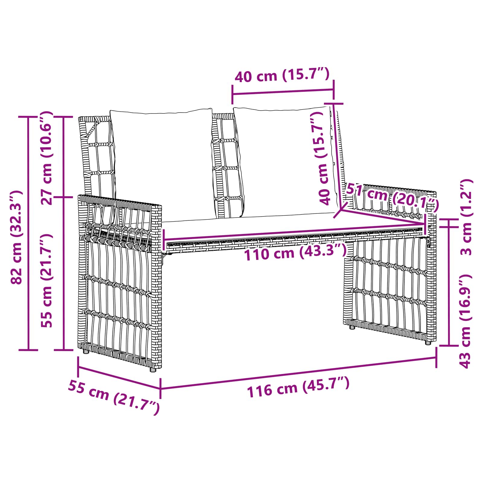 - 1 x sedežna blazina: 110 x 51 x 3 cm (D x Š x T)