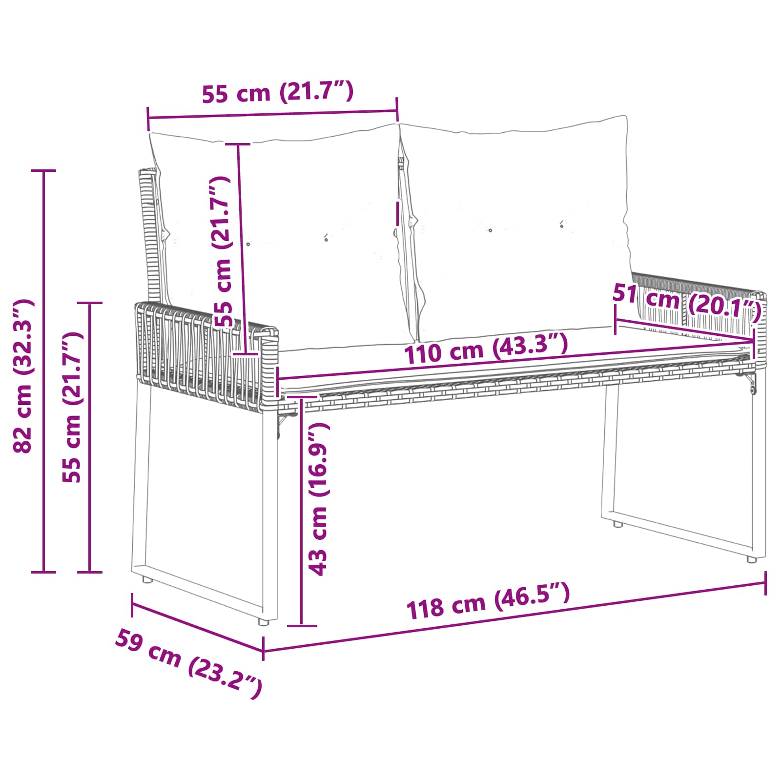 - 1 x Zunanja klop: 118 x 59 x 82 cm (D x Š x V)