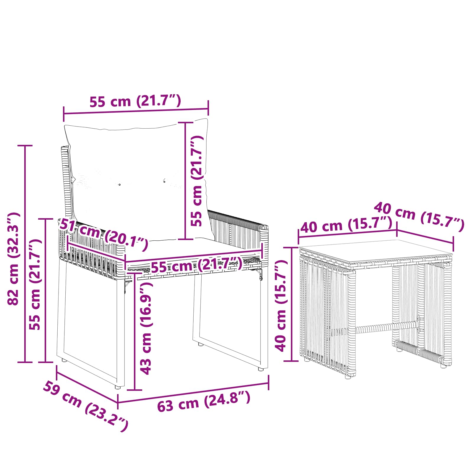- 1 x Miza: 40 x 40 x 40 cm (D x Š x V)