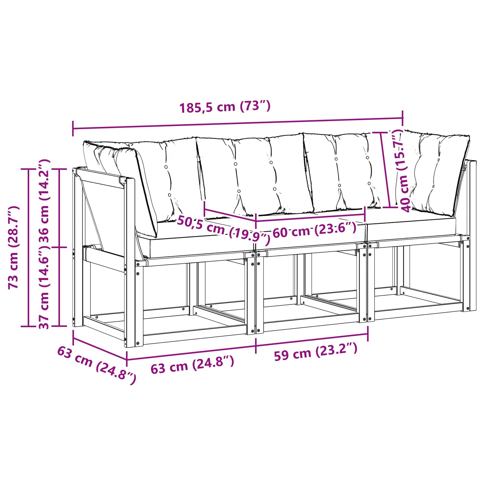 - 1 x srednji kavč: 59 x 63 x 73 cm (D x Š x V)