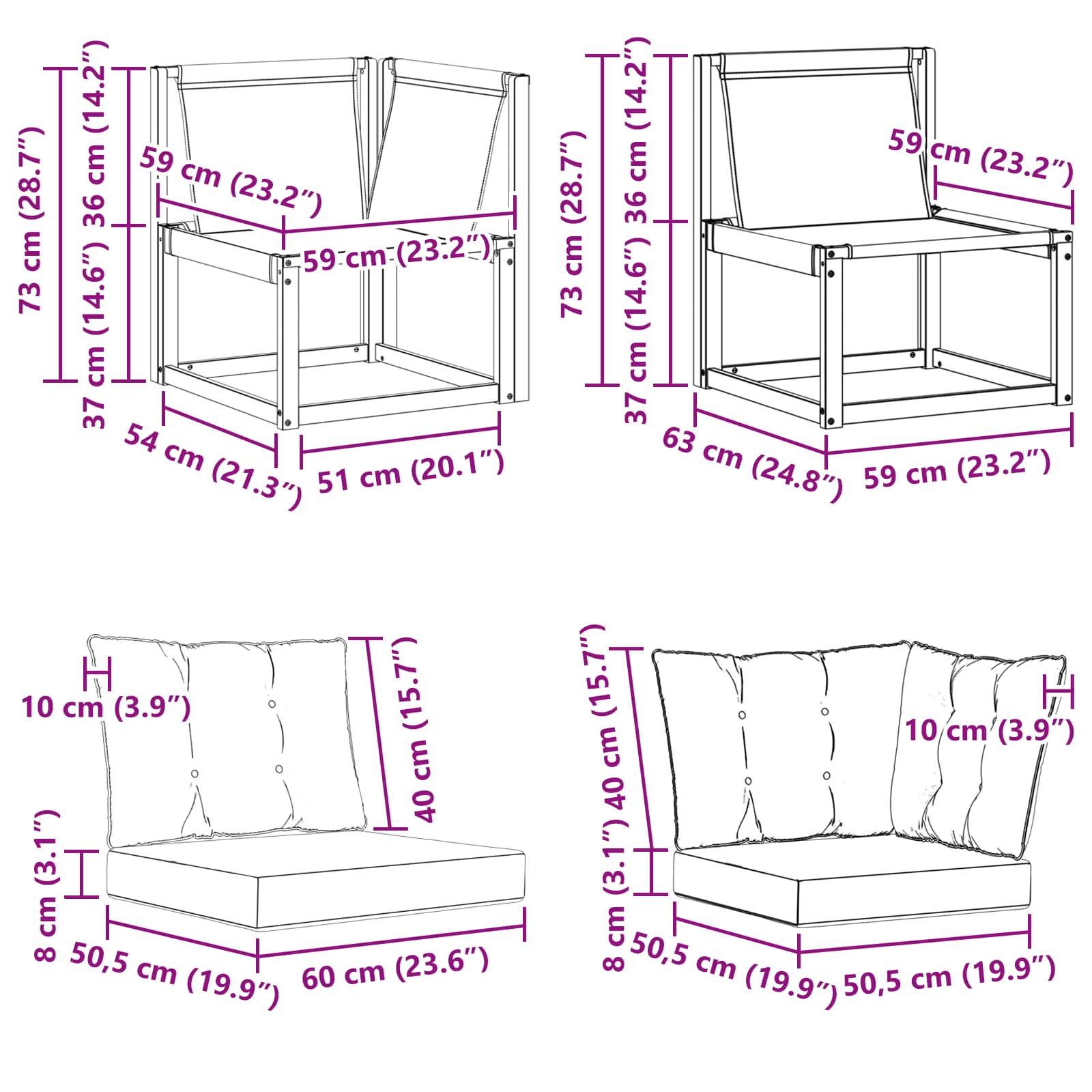 - 2 x sedežna blazina: 50,5 x 50,5 x 8 cm (D x Š x V)