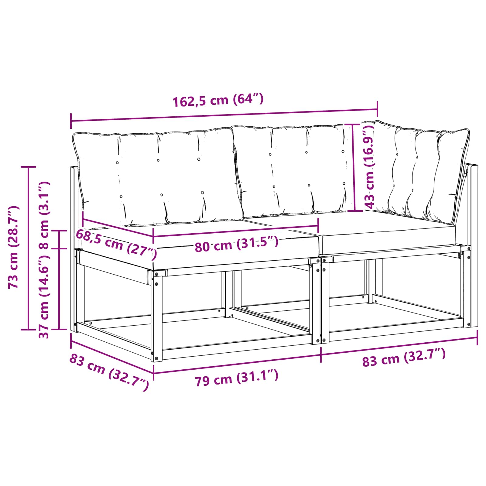 - 1 x Srednji kavč: 79 x 83 x 73 cm (DxŠxV)