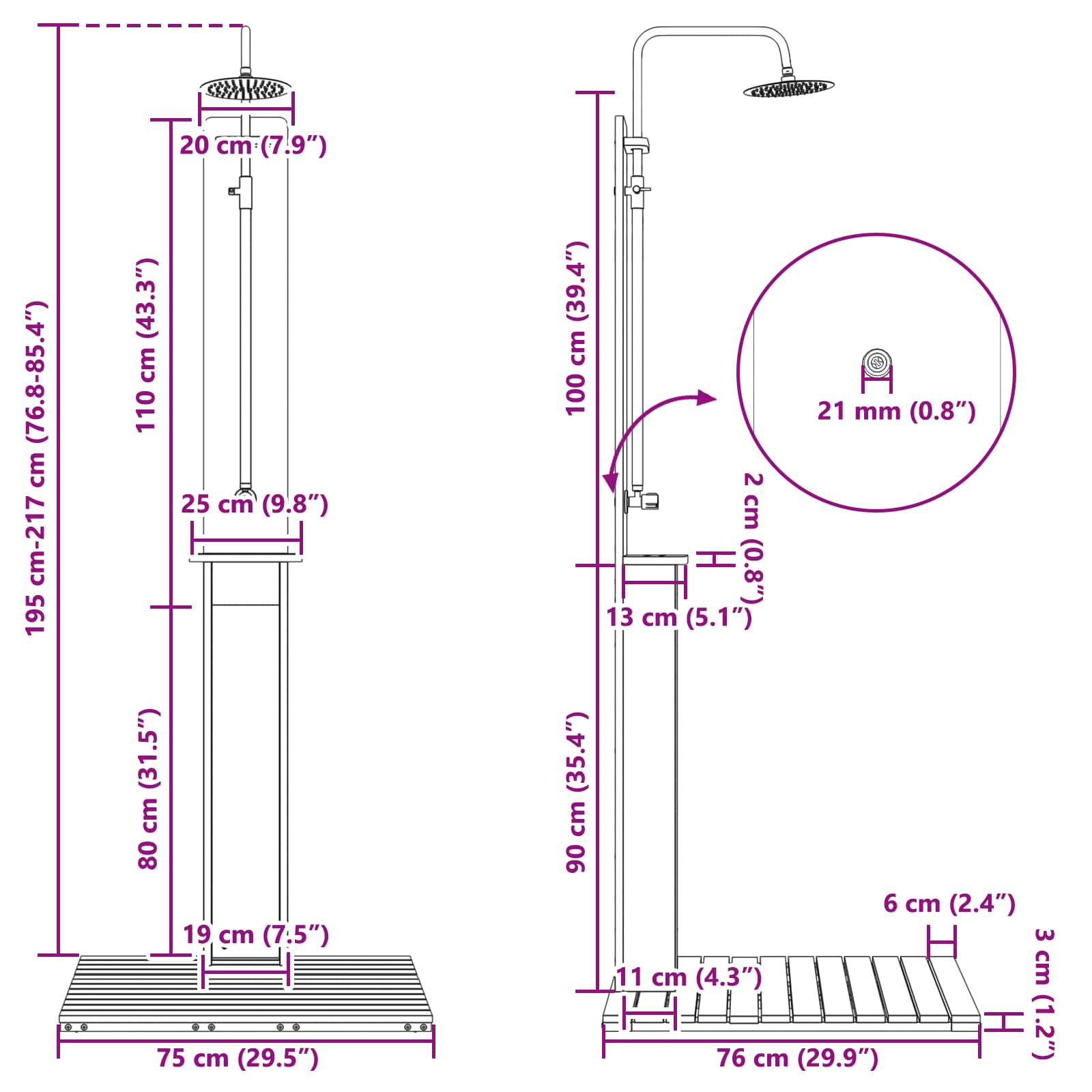 Ta sodoben zunanji tuš je ustvarjen za vrtne in terasne nastavitve, ponuja kombinacijo stila in funkcionalnosti. S čistimi linijami in minimalističnim dizajnom doda sodoben pridih zunanjim prostorom, idealen je ob bazenih ali kot samostojen element. Njegova trdna konstrukcija zagotavlja dolgo trajnost, medtem ko je odporen na vreme, kar pomeni, da lahko zdrži različne zunanje pogoje, obljublja dosledno delovanje in privlačen videz. Sodoben dizajn: Ta eleganten zunanji tuš, zasnovan z namenom preprostosti, se brez težav vklopi v sodobne krajine. Njegova uporabna zasnova ponuja funkcionalnost in estetsko privlačnost, idealen je za vrtove in obrežja bazenov. S sodobnim slogom poudarja njegov vizualni čar, kar ga dela za osrednji element na druženjih in sprostitvah na prostem. Trajnost: Zgrajen iz vrhunskih materialov, ki zagotavljajo dolgo življenjsko dobo, ta zunanji tuš se ponaša z UV odpornostjo, ki ga ščiti pred sončnimi poškodbami. Močna jeklena konstrukcija zagotavlja stabilnost tudi pri pogosti uporabi. Njegova odpornost na poškodbe nudi trdno rešitev za tiste, ki želijo dolgo kakovost in zanesljivost skozi vse leto. Odporen na vreme: Ta tuš je zasnovan za upiranje vremenskim vplivom in z vremensko odpornimi lastnostmi ščiti pred dežjem, soncem in drugimi neugodnimi pogoji. Konstrukcija preprečuje obrabo, ki je običajna pri zunanjem pohištvu, tako ostaja zanesljiva izbira za vaš zunanji prostor. Njegova odpornost močno zmanjša potrebo po vzdrževanju, kar vam omogoča, da uživate v prostem času. Zaščita pred rjo: Obdelava materiala učinkovito bori proti rji, kar ga dela primerno izbiro za vlažna okolja. Ne glede na to, ali je ob bazenu ali v vrtu, zagotavlja dolgotrajno zanesljivost brez skrbi o poslabšanju. Ta obdelava podaljšuje njegovo življenjsko dobo, kar predstavlja praktično rešitev za tiste, ki živijo na območjih z visoko vlažnostjo. Enostavna namestitev: Montaža zahteva dve osebi in izvijač, kar zagotavlja stabilnost ter učinkovitost takoj po namestitvi. Možnost enostavne sestave pomeni manj skrbi glede namestitve in več priložnosti za uživanje v vašem novem tušu. Jasna navodila vas vodijo skozi proces, kar olajša dodajanje enote v vaš zunanji prostor.