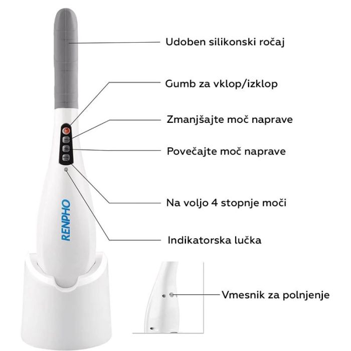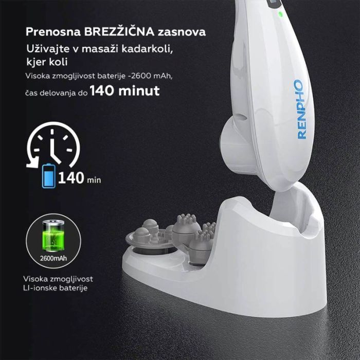 PREDNOSTI Zagotavlja olajšanje za različne mišične skupine Z nastavljivimi stopnjami hitrosti in načini omogoča sproščujočo masažo Zaradi svoje zasnove je namenjen težko dostopnim mestom na telesu Napravo lahko uporabljate kjer koli, ne da bi vas preveč motila Zamenljive glave za različne dele telesa